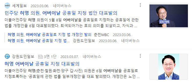 허영 더불어민주당 의원은 지난 6일 어버이날을 공휴일로 지정하는 '공휴일에 관한 법률' 일부 개정법률안을 대표 발의하기도 했습니다. 부모와 어르신에 대한 효의 의미는 점차 퇴색됨에 따라 경로효친의 미덕을 일깨우고 자녀들의 효 의식을 고취하는 등 상회적 관심을 환기시키기 위해 어버이날 공휴일로 지정하도록 했다고 설명했습니다.