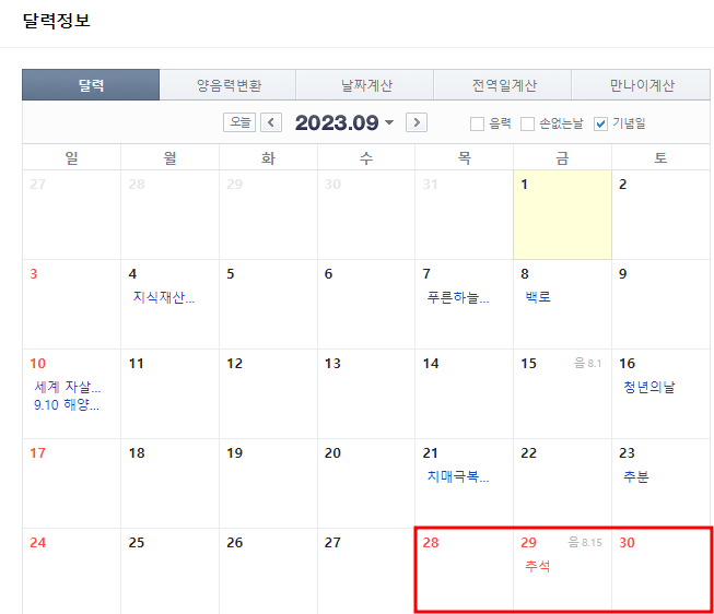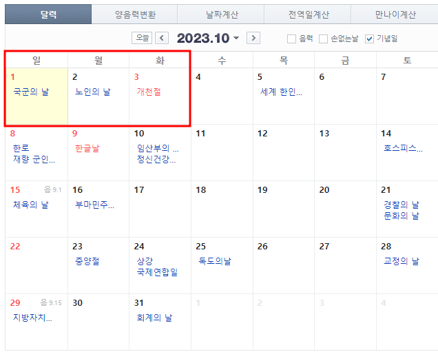 직장인들 사이에서는 2023년 10월을 기대하고 있습니다. 2023년 10월 2일 임시공휴일로 지정될 경우 9월 28일 추석 연휴를 시작으로 10월 3일 개천절까지 긴 연휴를 보낼 수 있게 됩니다. 아직 10월 2일 임시공휴일 지정 여부에 대해 정확히 논의된 바가 없어 상황을 좀 더 지켜봐야겠습니다.