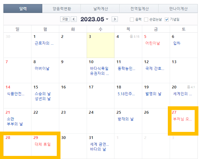 올해 부처님오신날부터 대체공휴일이 확정되어 황금연휴를 즐길 수 있게 되었습니다. 올해 석가탄신일이 5월 27일 토요일과 겹치면서 5월 29일이 대체공휴일로 대체됩니다.